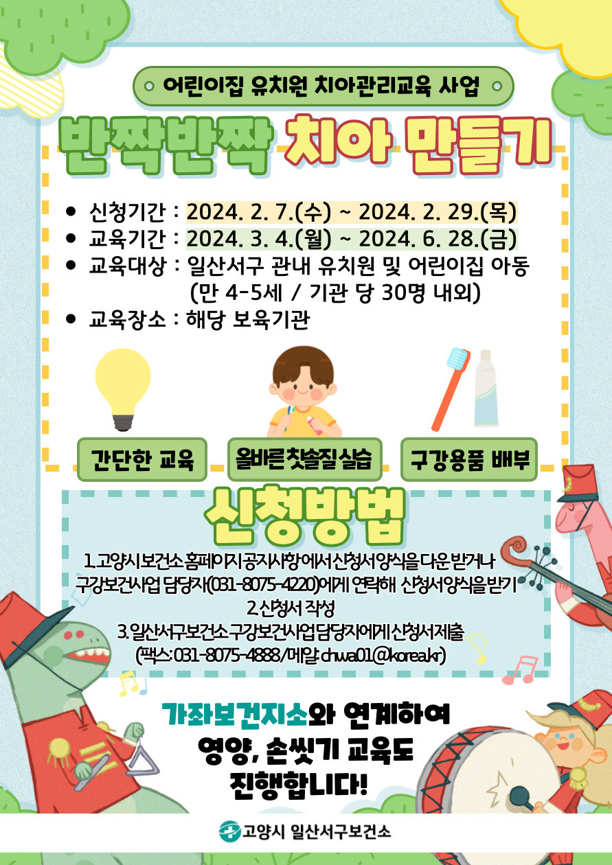[부자동네타임즈 = 김인수 기자] 고양특례시 일산서구보건소는 치아관리교육사업 ‘반짝반짝 치아 만들기’에 참여할 어린이집·유치원 교육기관을 모집한다고 8일 밝혔다.