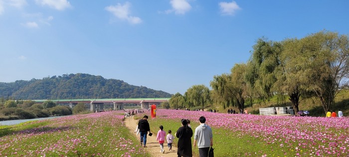 분홍 물결의 창릉천 코스모스 길은 SNS에서 서울 근교의 나들이 명소로 입소문을 타고 있다. 지난 23일까지 12만여 명이 방문했으며, 30일까지 축제가 진행된다.