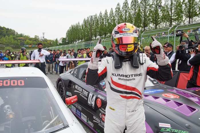 [사진 설명] 23일 경기도 용인에 위치한 에버랜드 스피드웨이에서 열린 2023 CJ대한통운 슈퍼레이스 챔피언십 슈퍼 6000 클래스 2라운드에서 2002년생 영건 드라이버 이찬준이 경기 종료 후 세레머니를 하고 있다.