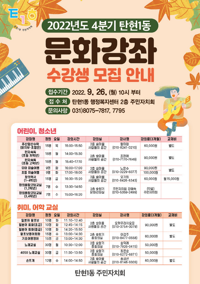 [부자동네타임즈 김인수기자] 고양특례시 탄현1동 주민자치회(회장 조경순)는 고양시민을 대상으로 올해 4분기 주민자치센터 프로그램 수강생을 모집한다. 모집기간은 9월 26일부터 30일까지이며 선착순 마감이다.