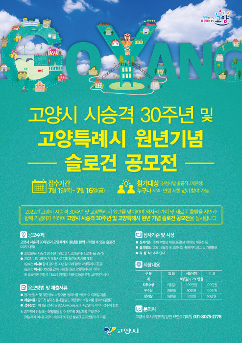 [부자동네타임즈 김인수기자] 고양시는 2022년 고양시 시승격 30주년과 고양특례시 원년을 맞아 역사적 가치 및 새로운 출발을 기념하기 위해 ‘고양시 시승격 30주년 및 특례시 원년 기념 슬로건 공모전’을 7월부터 개최한다.
