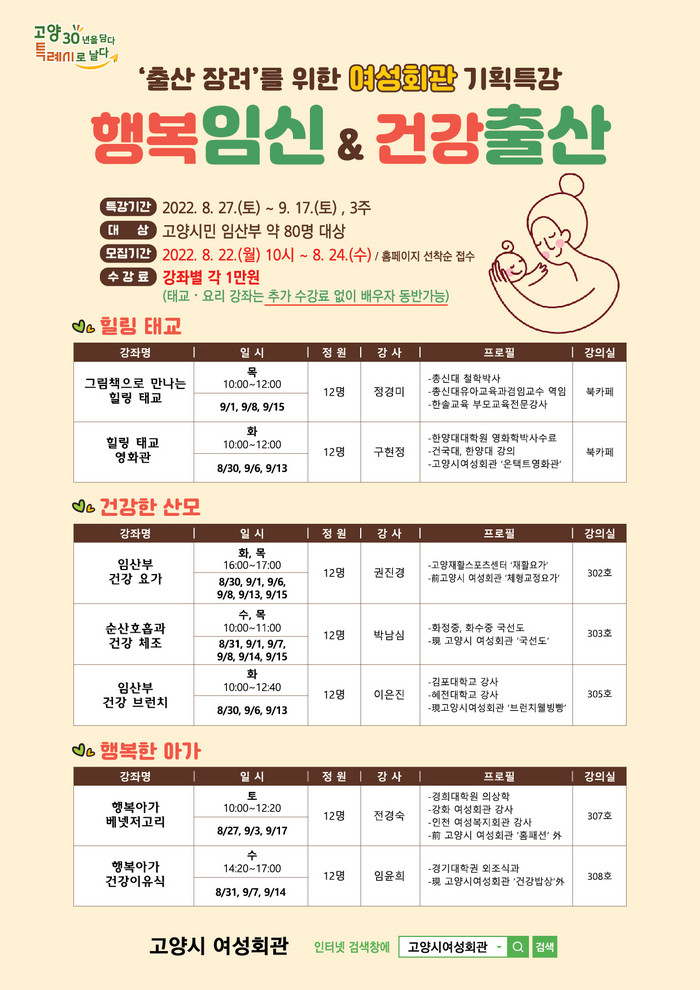 고양시는 임신과 출산을 축하하는 사회적 분위기를 조성하고 출산율을 높이기 위해 다양한 출산양육 지원 사업을 추진하고 있다. ‘행복 임신&건강 출산’ 특강은 임신과 출산을 맞이한 고양시민과 관내 직장을 다니고 있는 산모수첩소지자 등 100명을 대상으로 8월 27일부터 9월 17일까지 운영된다.