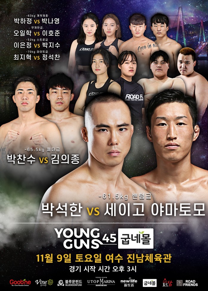 [부자동네타임즈 김인수기자] ROAD FC (로드FC)는 11월 9일 여수 진남체육관에서 굽네몰 ROAD FC YOUNG GUNS 45를 개최한다. 이 대회가 끝난 뒤에는 곧이어 굽네몰 ROAD FC 056이 개최된다.