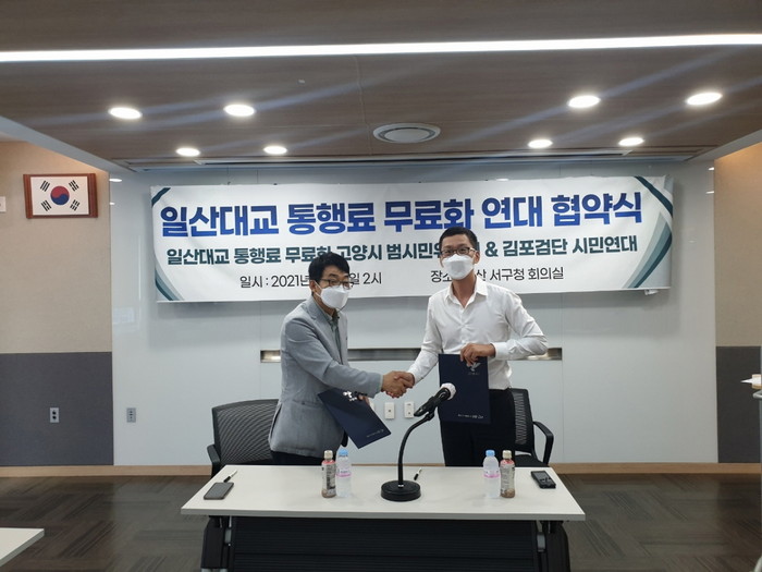 김천만 고양시 일산대교 무료화 범시민추진워원장은 "지난 21일 고양시 일산서구청에서 일산대교 무료화 범시민 추진에 필요한 긴밀한 협력관계를 다지기 위해 서형배 김포시 김-검 시대 시민단체위원장과 양해각서를 체결했다.