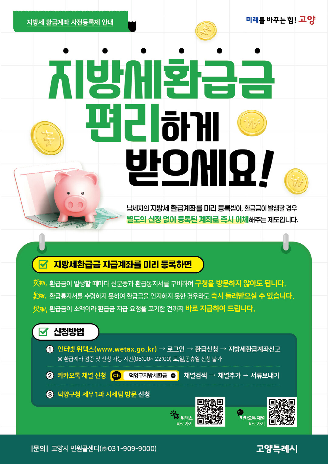 [부자동네타임즈 = 김인수 기자] 고양특례시 덕양구는 지방세 환급금이 발생할 때마다 납세자가 매번 환급금 지급 청구를 해야 하는 번거로움을 덜기 위해 지방세 환급계좌 사전등록을 적극 홍보하고 있다.