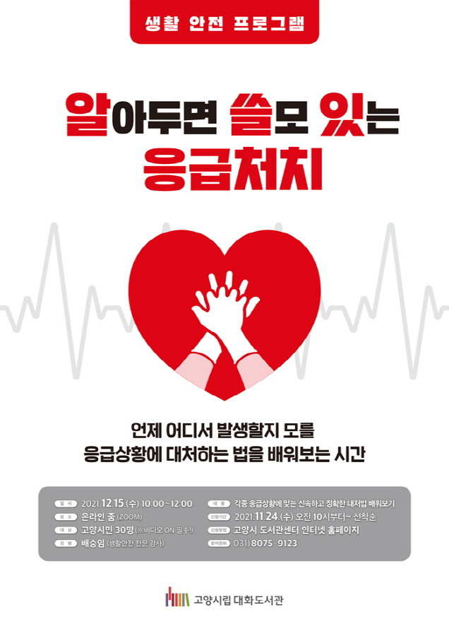 [부자동네타임즈 김인수기자] 고양시 대화도서관은 시민들의 안전을 위한 문화프로그램 「알아두면 쓸모 있는 응급처치」를 오는 12월 15일 온라인으로 운영한다.