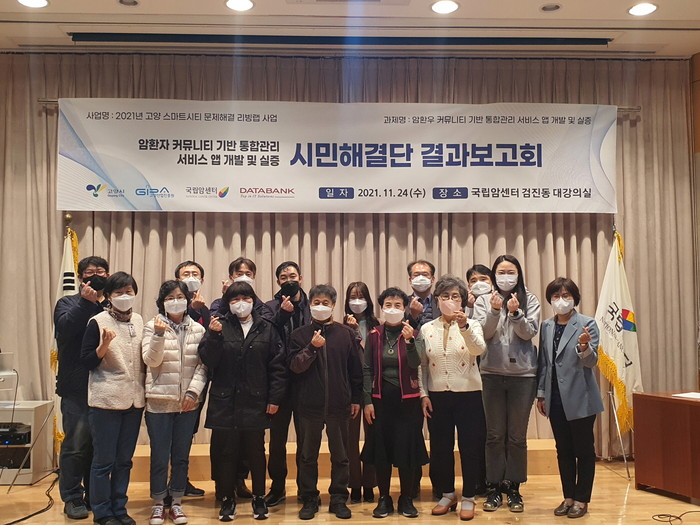 보고회에는 고양시민으로 구성된 암환우 시민해결단과 사업 수행기업(주, 데이타뱅크), 동국대학교 김민수 교수, 국립암센터 및 진흥원 관계자가 참석했다.
