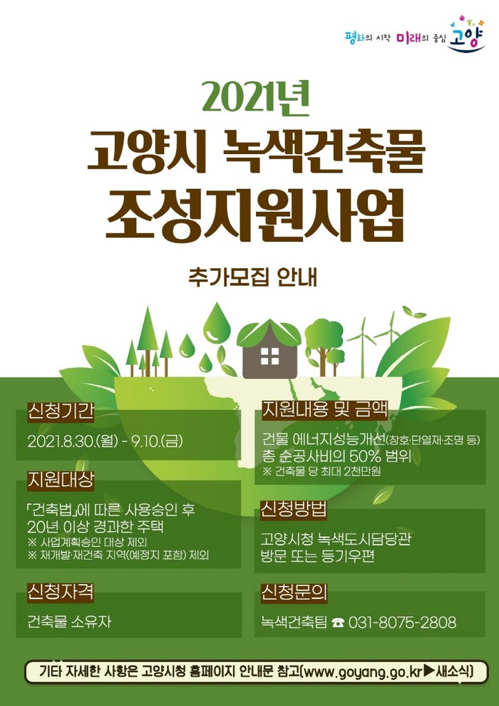 [부자동네타임즈 김인수기자] 고양시가 노후주택의 에너지효율 향상과 시민의 주거환경 개선을 위한 “2021년 녹색건축물 조성 지원 사업” 대상자를 내달 10일까지 추가 모집한다.