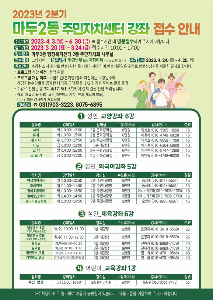 마두2동 주민자치센터 문화강좌 접수는 3월 21일부터 24일까지 매일 오전 10시부터 17시(12시~13시 제외)까지 마두2동 행정복지센터 2층에서 선착순으로 접수받는다.