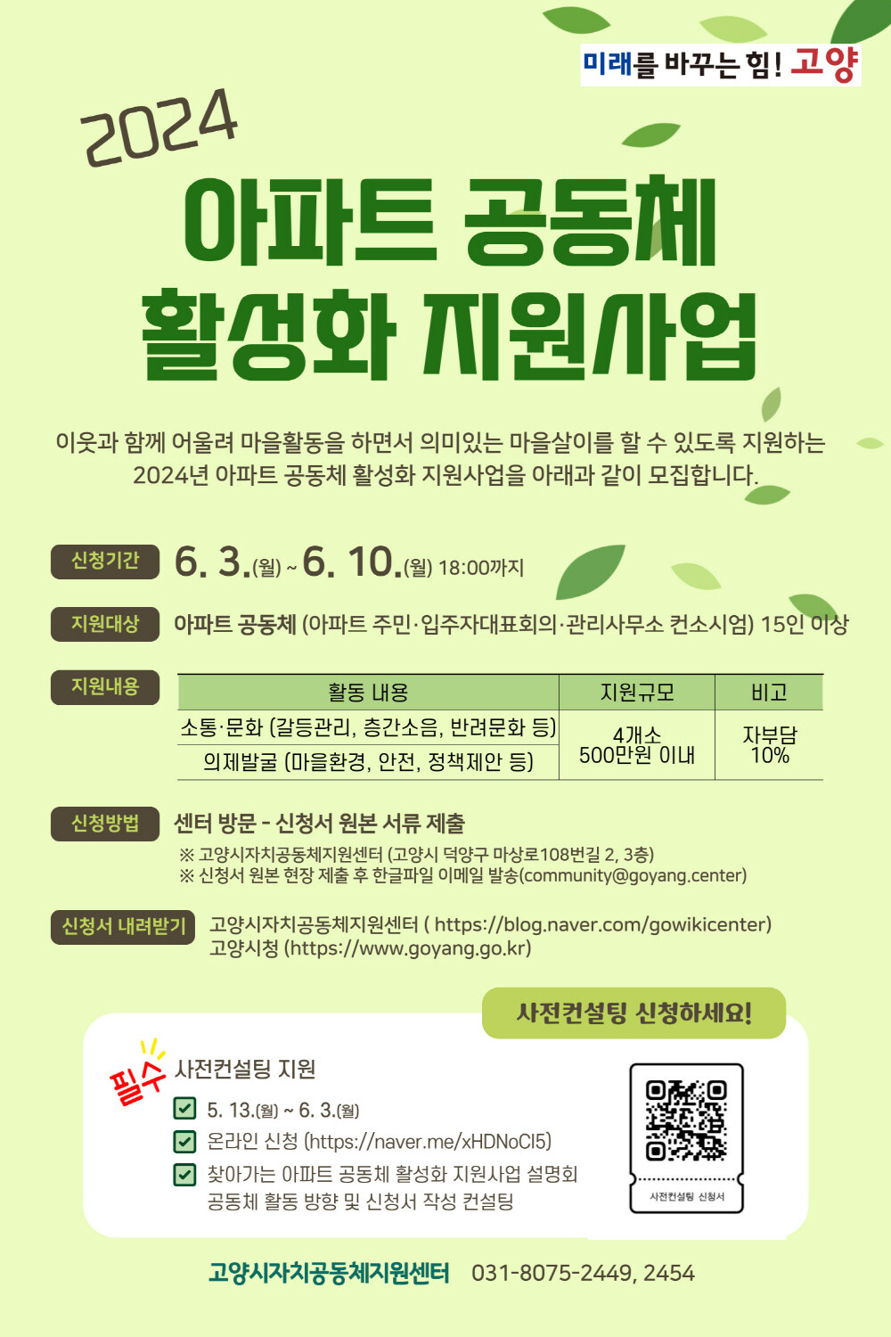 고양시자치공동체지원센터에서는 5월 13일부터 6월 3일까지 찾아가는 사업설명회와 사전 컨설팅을 지원하며, 온라인(https://naver.me/xHDNoCI5)으로 신청받는다.