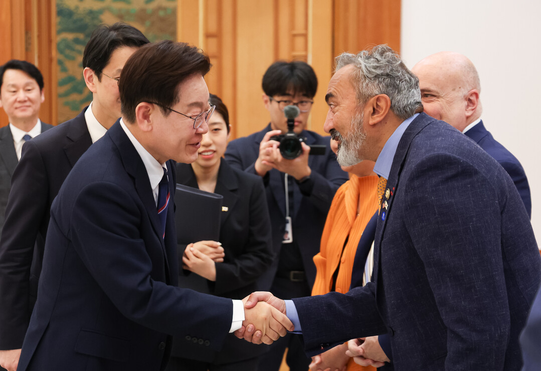 [부자동네타임즈 = 조영재 기자] 이재명 대통령이 31일 청와대에서 미국 하원의원단 접견을 하며 아미 베라 의원과 악수하고 있다. 2026.3.31
