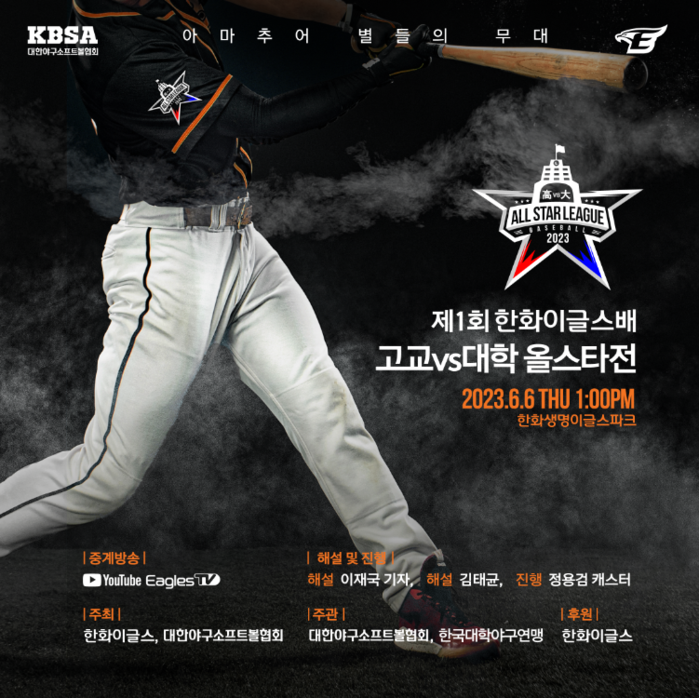 [부자동네타임즈 김인수기자] 대한야구소프트볼협회(회장 이종훈, 이하 협회, KBSA)와 한화 이글스는 오는 6월 6일(화) 한화생명이글스 파크에서 개최되는 2023 제1회 한화 이글스배 고교·대학 올스타전 경기에 참가할 고교, 대학 선수단을 최종 선발했다.