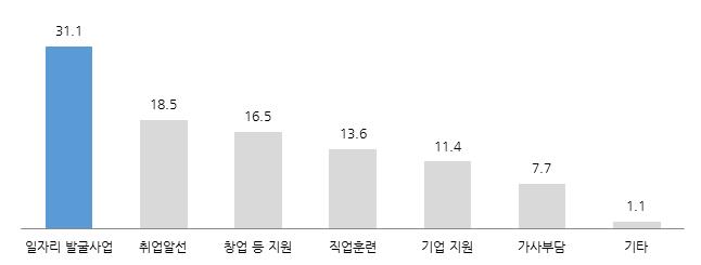 일자리 창출을 위한 우선 분야로 ‘일자리 발굴사업’이 31.1%로 가장 높게 응답되었고, ‘취업 알선’ 18.5%, ‘창업 등 지원’ 16.5%, ‘직업훈련’ 13.6%, ‘기업 지원’ 11.4%, ‘가사부담 경감’ 7.7% 등의 순으로 조사되었다.