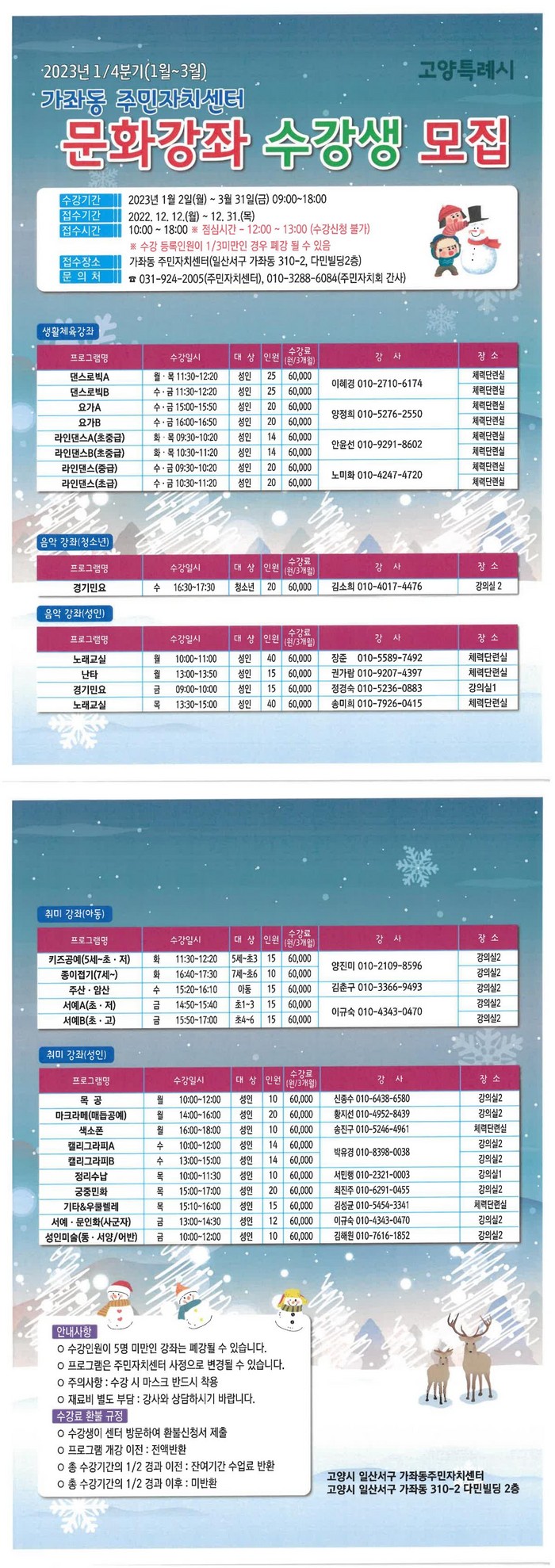 [부자동네타임즈 김인수기자] 고양특례시 일산서구 가좌동 주민자치회는 12월 12일부터 12월 31일까지 2023년 1분기(1~3월) 주민자치센터 문화강좌 신규 수강생을 모집한다.