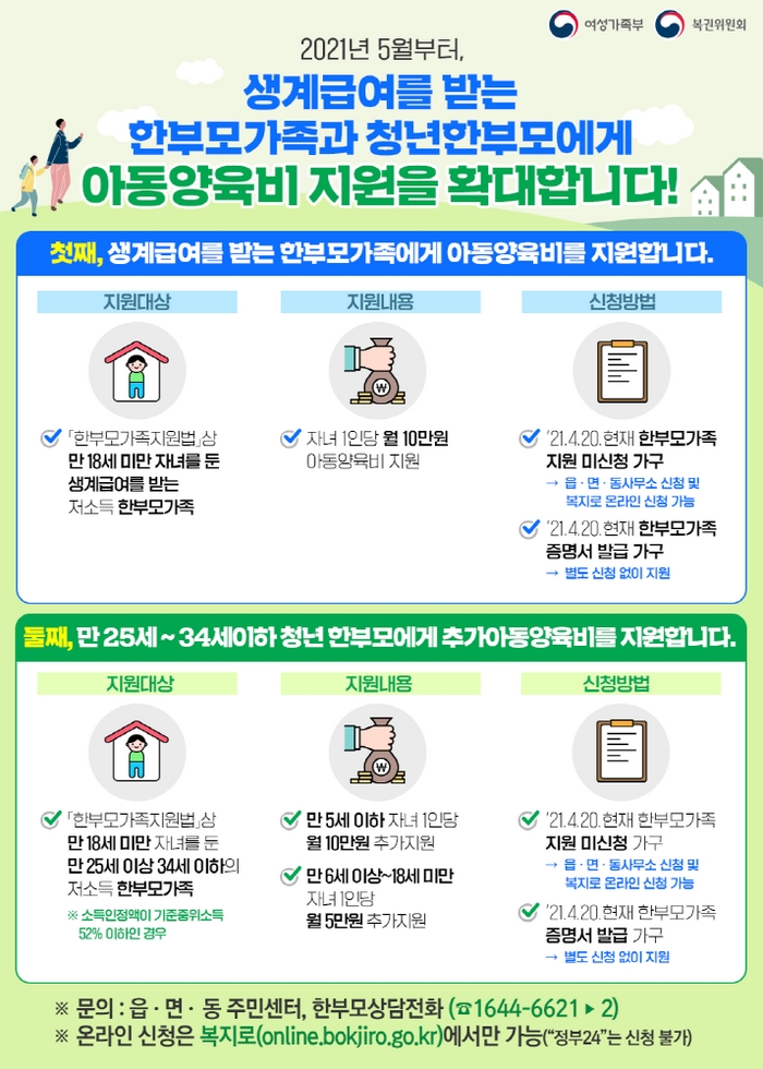 [부자동네타임즈 김인수기자] 고양시 일산서구(구청장 이재혁)는 한부모가족지원법 개정·시행(‘21. 4. 21.)됨에 따라, 오는 5월부터 생계급여를 받는 한부모가족과 청년 한부모가족에 대한 아동양육비 지원을 확대한다.