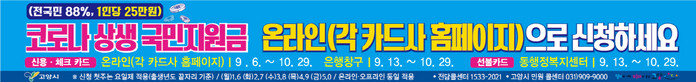 코로나 상생 국민지원금은 10월 29일까지 신청할 수 있으며 신용.체크카드, 고양페이, 선불카드 등으로 지급된다.