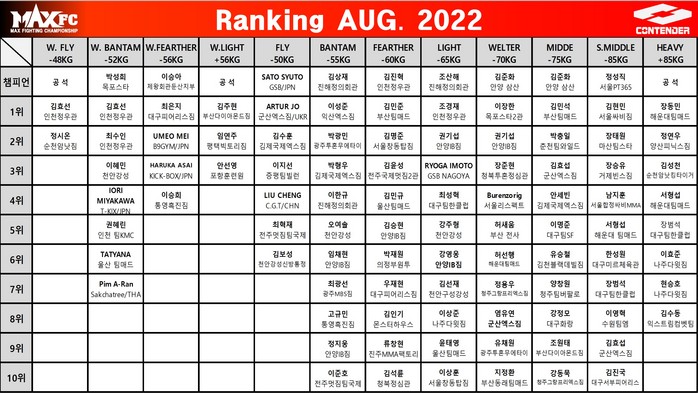 [부자동네타임즈 김인수기자] 지난 7월 열린 MAX FC 퍼스트리그 20 대회 출전 선수들의 랭킹 진입 및 순위 상승이 눈에 띈다.