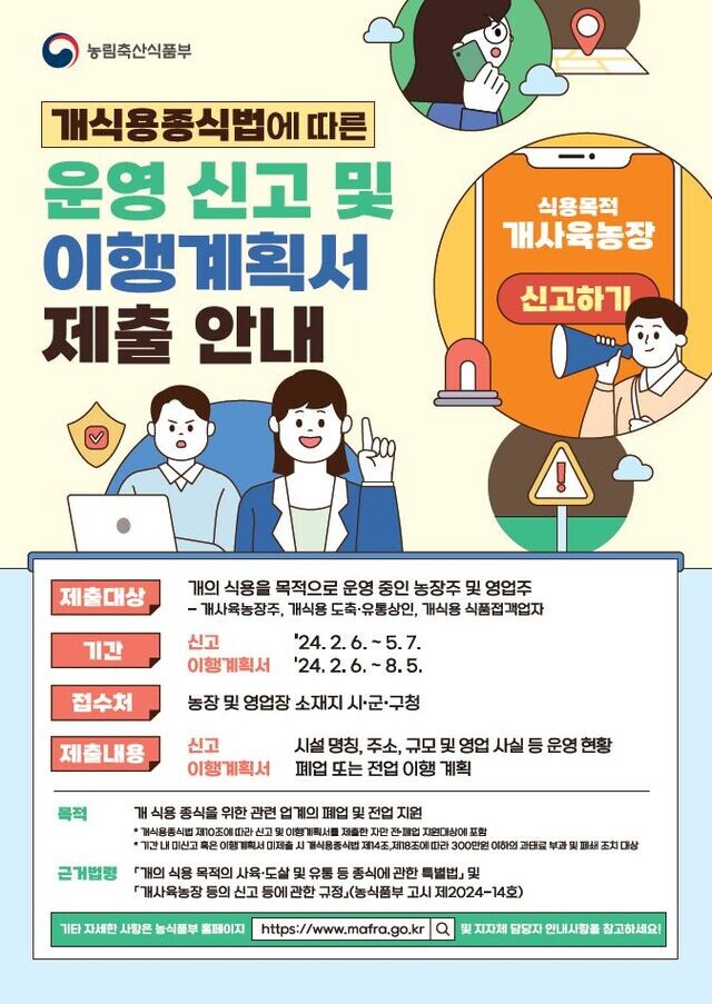 운영신고서 및 이행계획서 접수는 지난 2월 6일 개의 식용목적의 사육·도살 및 유통 등 종식에 관한 특별법(이하 개식용종식특별법) 공포에 따른 것이다.