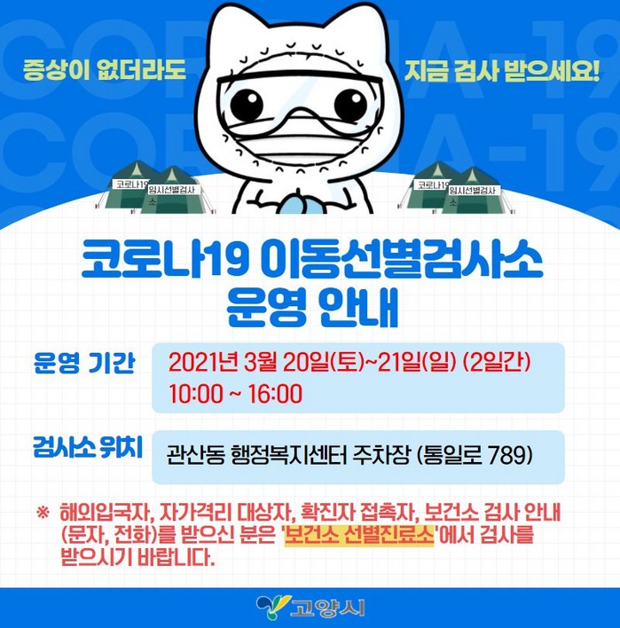 [부자동네타임즈 김인수기자] 고양시는 "오는 20일부터 21일까지 이틀간 관산동 행정복지센터 주차장에 코로나19 이동선별검사소를 운영한다."고 밝혔다.