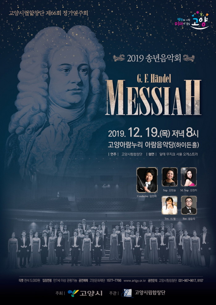 [부자동네타임즈 김인수기자] 다채로운 공연과 연주로 문화예술도시로서 고양시의 위상을 높이고 있는 고양시립합창단이 제66회 정기연주회, ‘송년음악회, 헨델 메시아’를 오는 12월 19일(목) 저녁 8시에 고양아람누리 아람음악당(하이든홀)에서 개최한다. 고양시립합창단, 4인의 솔리스트, 알테 무지크 서울의 연주로 연말의 기쁨을 함께하는 웅장한 무대가 펼쳐질 예정이다.