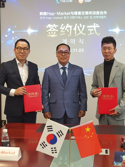 [부자동네타임즈 김인수기자] 한국 글로벌 종합 쇼핑몰 HAP-market이 중국 대형거래소 단향(TXB)거래소와 블록체인 기술기반으로 한국과 중국 정보 공유, 마케팅 등 분야에 전략적 합작하기로 하는 계약을 2019년 11월 3일 중국에서 성황리에 마치고 암호화폐 시장규모가 세계에서 제일 큰 시장인 중국시장에 상장하였다.