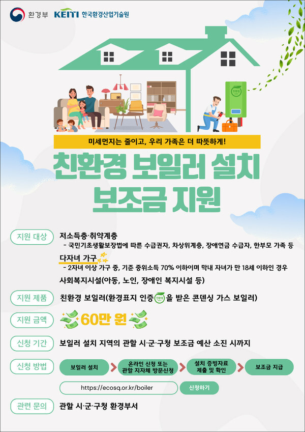 시는 추경으로 사업비를 추가 확보함에 따라 올해 연말까지 저소득층, 다자녀가구, 사회복지시설 등 취약계층을 대상으로 가구당 60만원씩 가정용 친환경 보일러를 당초 70대에서 84대로 추가 지원하게 되었다.