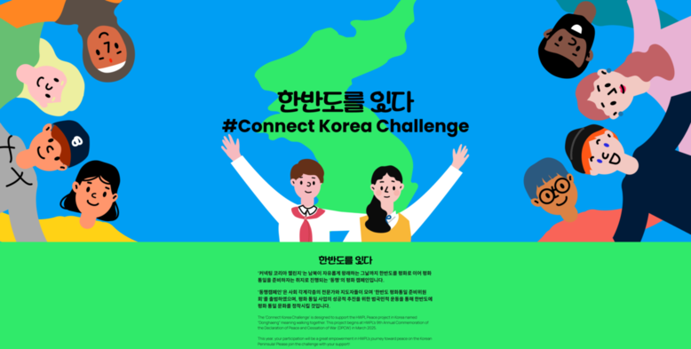 한편 HWPL은 남북의 자유왕래 촉구와 국제적 지지를 통한 통일의식 고취를 위해 ‘한반도를 잇다(커넥트 코리아) 챌린지’(https://togetherconnectkorea.kr)를 진행 중에 있다. 시작 10일만에 72개국 243개 도시에서 시민들이 참여했고 1,350개 이상의 콘텐츠가 등장했다.