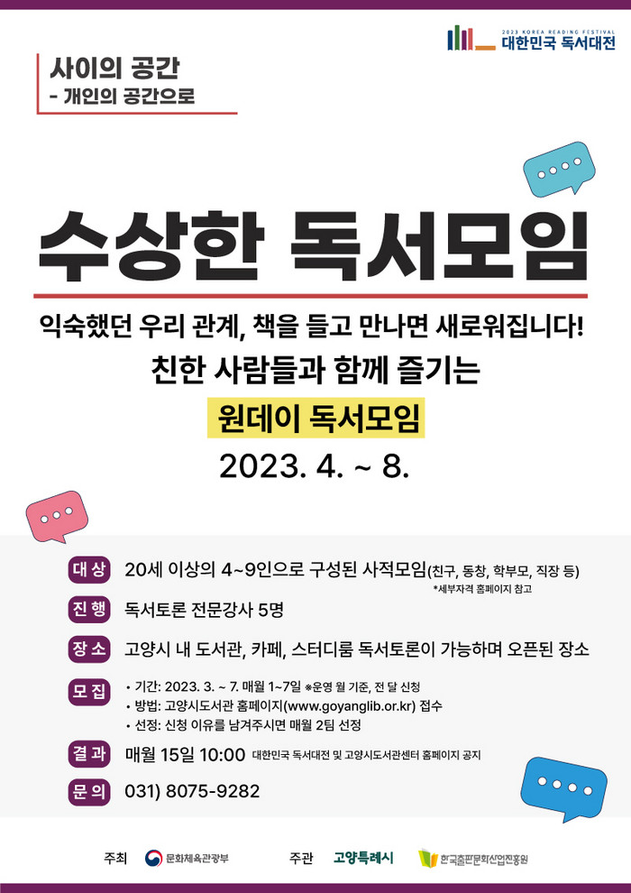 수상한 독서모임은 오는 4월부터 8월까지 5개월간 매월 2팀을 선정해 총10회 진행된다. 독서 리더와 모임을 매칭하여 이루어진다. 신청은 20세 이상 4~9인으로 구성된 사적모임(친구, 동창, 학부모, 직장동료 등)으로 도서관, 카페, 스터디룸 등 오픈된 장소를 섭외할 수 있어야 한다.