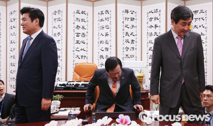 | △ 정의화(가운데) 국회의장과 원유철(왼쪽) 새누리당 원내대표, 이종걸 새정치민주연합 원내대표가 5일 오후 서울 여의도 국회에서 열린 의사일정 등 국회 정상화 논의를 위한 회동에 앞서 기념촬영 후 각각 자리로 향하고 있다. <사진제공=포커스뉴스> |