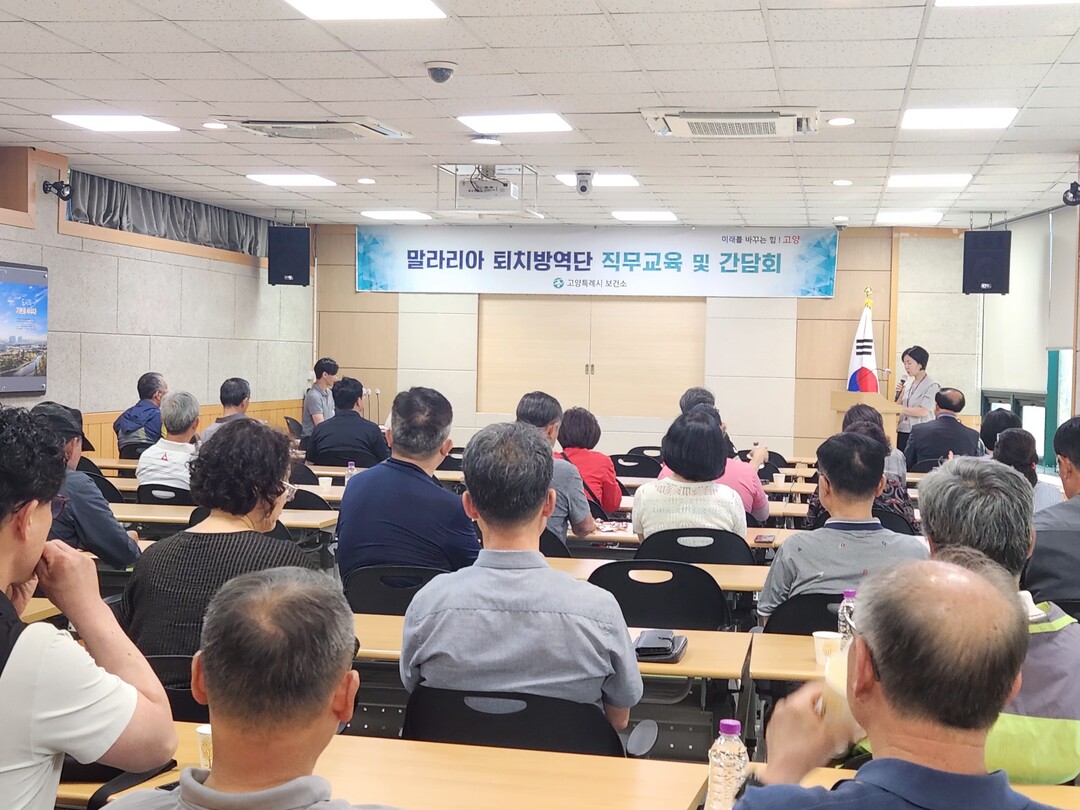 이번 간담회는 고양시 관계자 및 자율방역대원, 민간용역 등 56명이 참석했으며 최근 급증하는 말라리아 매개 모기의 효율적 퇴치를 위한 교육도 이루어졌다.