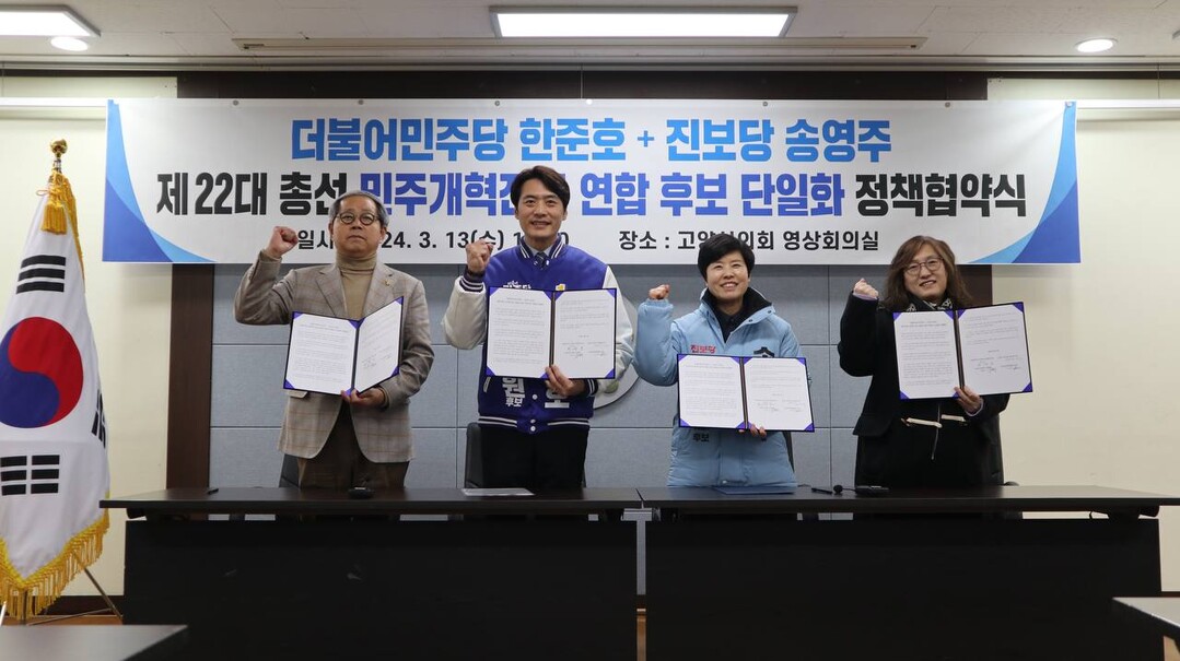더불어민주당 한준호 후보와 진보당 송영주 후보는 13일(수) 고양시의회 영상회의실에서 야권후보 단일화를 위한 정책협약식을 개최하고, 연대를 강화해나가기로 했다.