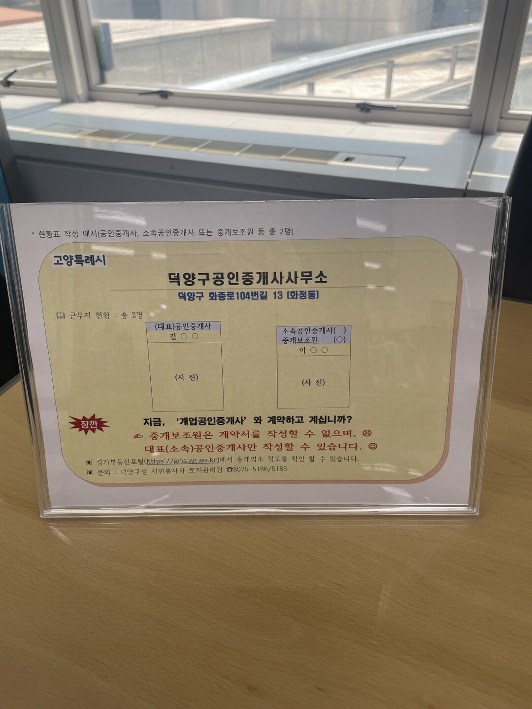 [부자동네타임즈 = 김인수 기자] 고양특례시 덕양구는 건전한 부동산 거래질서 확립을 위해 관내 등록된 공인중개사 사무소 1,000여 개소를 대상으로 근무자 현황판을 제작·배포했다고 7일 밝혔다.