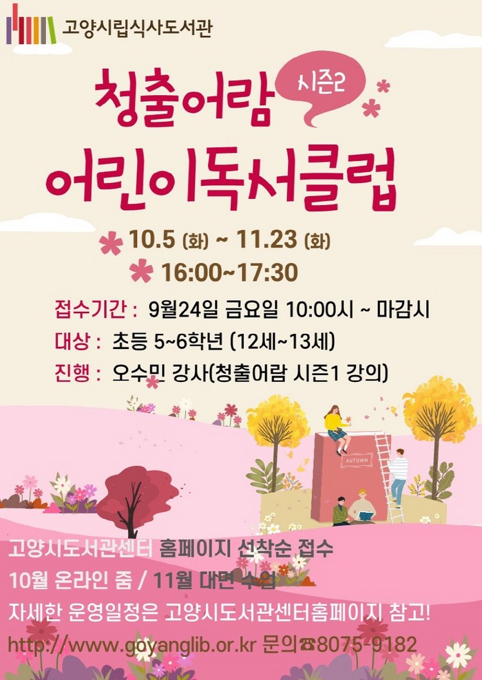 [부자동네타임즈 김인수기자] 고양시 식사도서관은 초등학교 5~6학년 12명을 대상으로 소수정예 어린이 독서클럽 ‘청출어람 독서클럽’ 시즌2를 오는 10월 5일부터 운영한다.