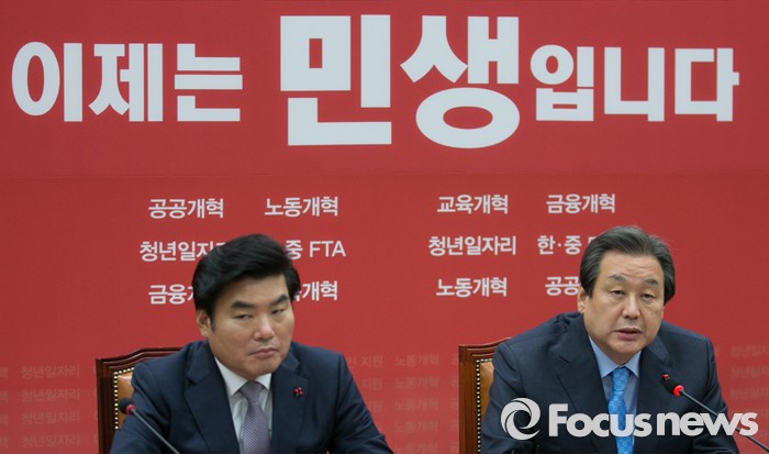 | △ 김무성(오른쪽) 새누리당 대표와 원유철 원내대표가 7일 오후 서울 여의도 국회에서 박근혜 대통령과의 법안 처리 관련 회동을 마친 뒤 취재진에게 결과 설명을 하고 있다. <사진제공=포커스뉴스> |