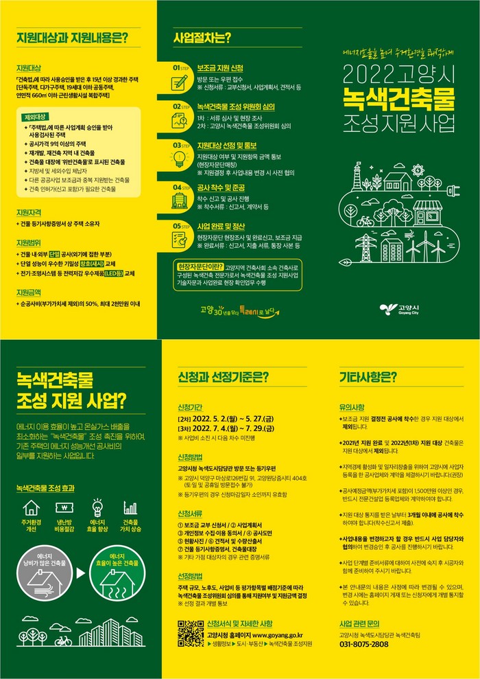 지원을 희망하는 대상 건축물 소유자는 고양시 홈페이지 공고 및 새소식에 첨부된 관련서류를 내려 받아 작성 후 고양시청 녹색도시담당관 녹색건축팀(고양시 덕양구 마상로 126번길 91, 줌시티 404호)으로 7월 4일부터 7월 29일까지 방문 또는 등기 우편으로 제출하면 된다.