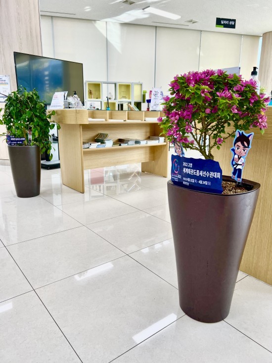 일산서구는 민원실에 화사한 봄꽃과 고양 세계태권도품새선수권대회 캐릭터를 함께 배치하여 대회를 홍보함과 동시에 코로나에 지친 시민들이 잠시나마 힐링할 수 있는 편안한 환경을 조성했다. 또한, 그린힐링 오피스를 위해 비치한 공기정화식물의 생육상태를 수시 점검해 민원실을 방문하는 시민들에게 보다 쾌적한 환경을 제공하고자 노력하고 있다.