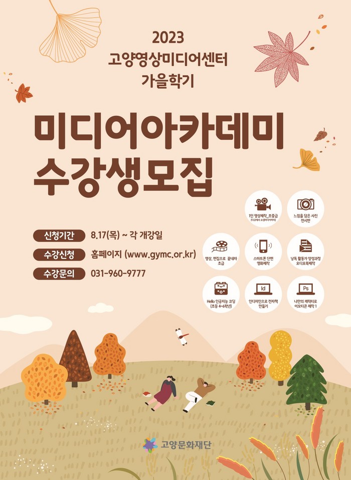 [부자동네타임즈 김인수기자] 산하 고양문화재단 고양영상미디어센터에서 미디어아카데미 가을학기(9월~11월) 수강생을 모집한다.