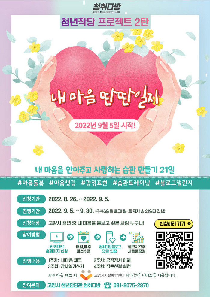 ‘내마음딴딴일지’ 쓰기 챌린지는 길어진 코로나19로 인해 무기력과 불안에 시달리는 청년의 마음 건강을 증진하기 위해 9월 5일부터 21일간 진행된다.
