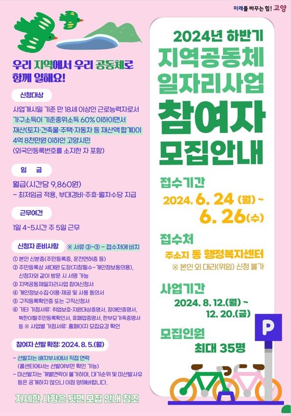 [부자동네타임즈 = 김인수 기자] 고양특례시가 취업 취약 계층의 경제적 안정을 지원하고, 지역사회 발전에 기여하기 위해 ‘2024년 하반기 지역공동체일자리사업’참여자를 모집한다.