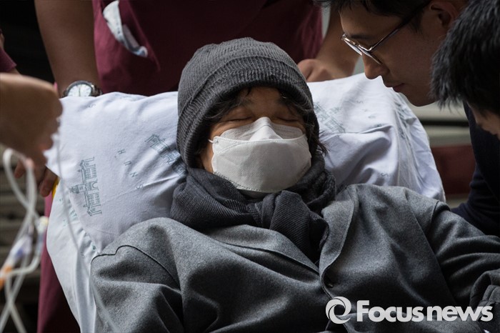 | △ 이재현 CJ그룹 회장이 지난달 10일 오후 서울 고등법원에서 재판을 받기 위해 법원 앞에서 휠체어를 타고 있다. <사진제공=포커스뉴스> |