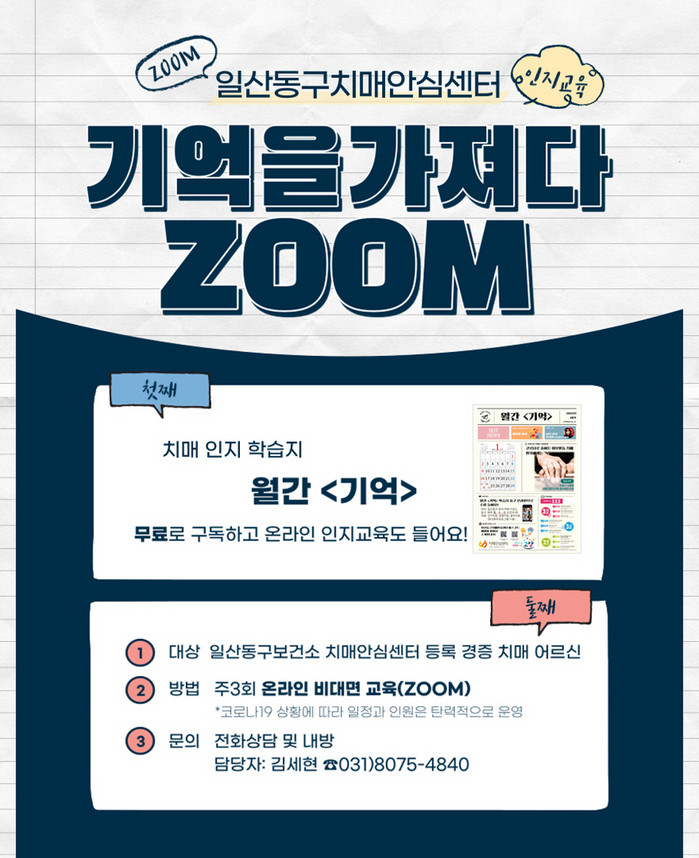 인지학습지 ‘월간 기억’과 온라인 인지 교육 ‘기억을 가져다줌’ 프로그램은 현재 참여 대상자를 모집 중이다. 일산동구 관내 치매진단자라면 누구나 무료로 참여 가능하다. 기타 문의 사항은 일산동구보건소 치매안심센터로 문의하면 된다.