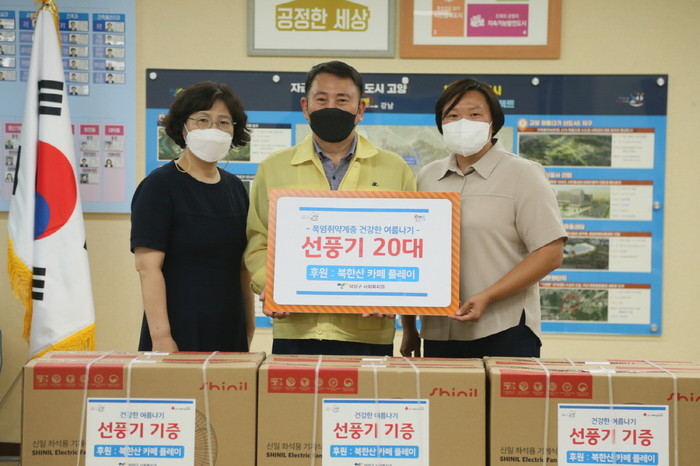 [부자동네타임즈 김인수기자] 고양시 덕양구(구청장 명재성)는 "지난 7월 29일 카페 플레이(대표 김연주)에서 폭염을 대비해 취약계층을 위한 선풍기 20대를 기탁했다."고 밝혔다.