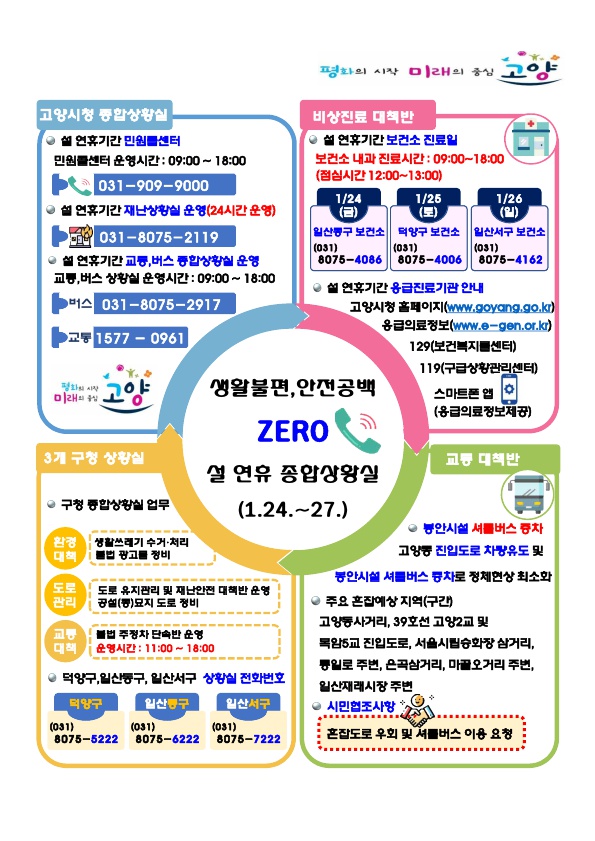연휴기간동안 동파·누수·응급환자 발생에 대비해 비상근무체제에 돌입하고, 귀성객들을 위한 주차장 무료개방, 다양한 교통대책도 마련해 시민불편을 최소화하도록 노력하고 있다. 또한 설 연휴 종합상황실을 꾸려, 연휴기간 내에 발생할 수 있는 재난·의료·교통·생활민원 등의 분야에서 모든 시민들이 안전한 명절 연휴를 보낼 수 있도록 노력할 방침이다.