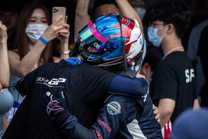 [사진설명] 서한 GP 장현진이 2020 CJ대한통운 슈퍼레이스 챔피언십 개막라운드에서 3위를 차지한 뒤 팀 동료들과 함께 기뻐하고 있다.