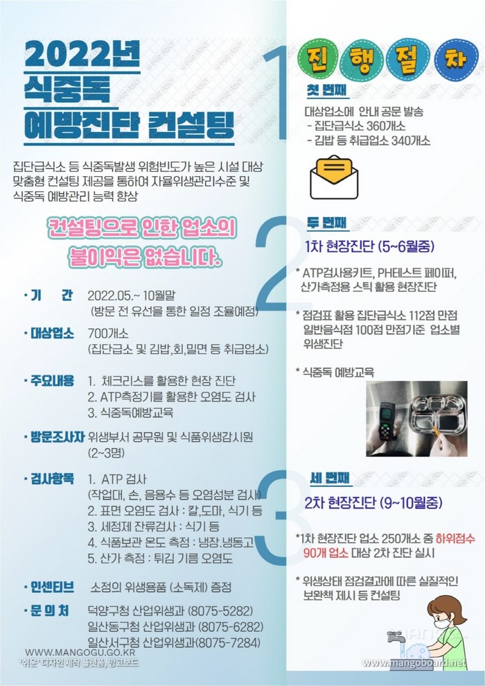 주요 컨설팅 내용은 작업대, 손 등의 ATP검사, 칼, 도마, 식기 등의 표면 오염도 검사, 식기 등의 세정제 잔류검사, 식품 등의 위생적 취급기준 준수, 개인위생관리, 유통기한 경과제품 보관·사용 여부 등이며 조리장 내 식중독균을 살균하기 위한 기구소독제도 함께 배부할 예정이다.