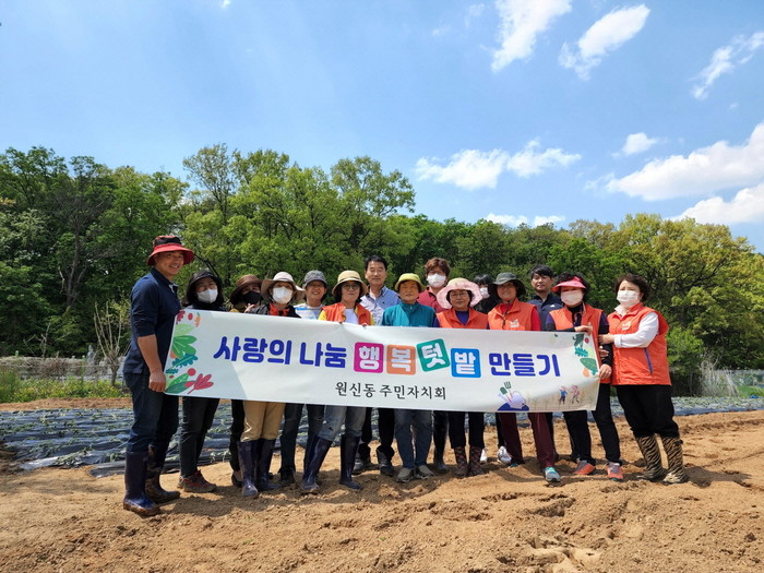 이날 주민자치회 위원 및 원신동장 등 20여 명은 밭을 갈고, 비닐을 씌운 후 고구마 모종을 심었으며, 9월 수확해 관내 저소득계층에게 기부할 예정이다.