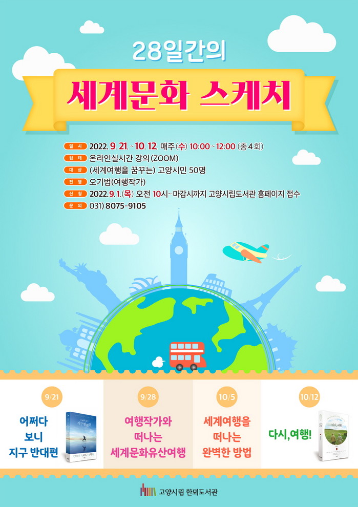 [부자동네타임즈 김인수기자] 고양특례시(시장 이동환) 한뫼도서관이 9월 21일부터 오기범 작가와 함께하는 여행인문학 수업 28일간의 세계문화 스케치를 운영한다.