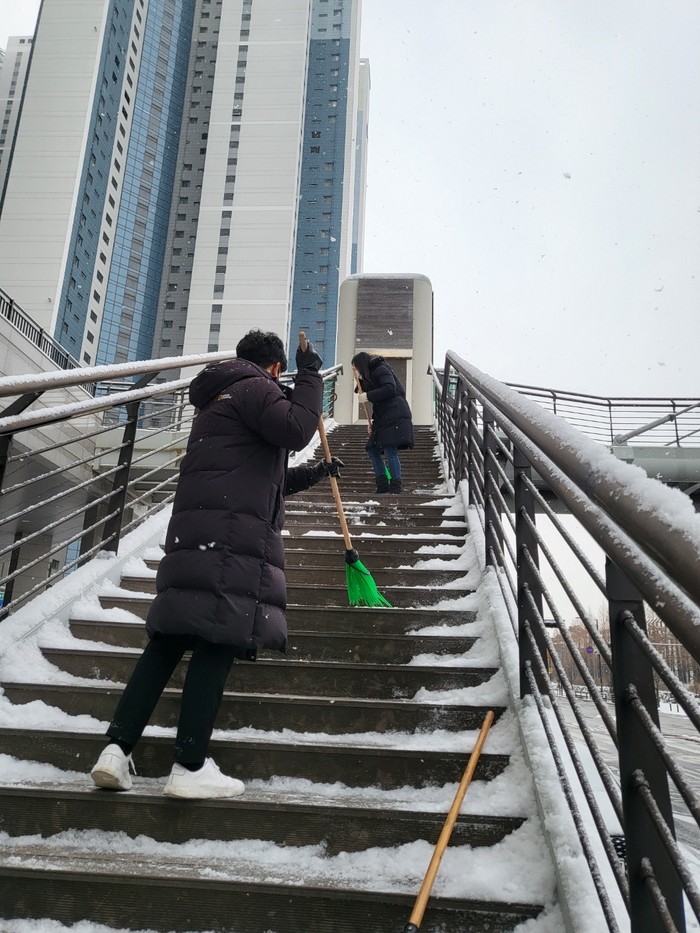 26일 05시 예측대로 대설주의보가 발효됨에 따라 신속히 시민통행이 많은 보도, 육교, 버스정류장 및 취약구간 등을 중심으로 제설작업을 실시했다. 또한 청사 앞 인도와 건널목에 쌓인 눈을 청소하여 청사를 이용하는 시민들의 안전과 편의를 확보했다.