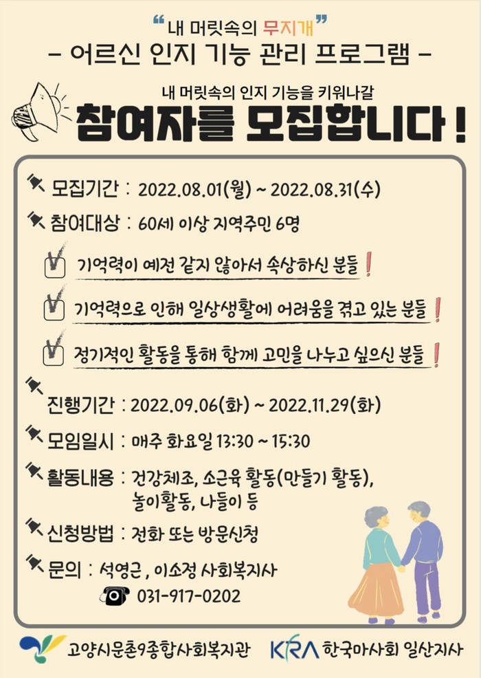 2022년 9월부터 2022년 11월까지 주 1회 2시간의 활동을 진행하며 참여 대상은 고양시에 거주하는 60세 이상 지역주민이면 누구나 가능하다. 참가 신청은 8월 31일까지 고양시문촌9종합사회복지관에 전화 신청 또는 복지관에서 방문 신청 할 수 있다.