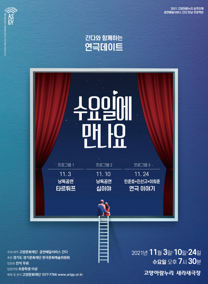 지난 11월 3일(수)에 첫 번째 프로그램인 낭독공연 타르튀프를 성황리에 마쳤으며, 오는 11월 10일(수)에는 셰익스피어의 대표작으로 구지선이 연출한 낭독공연 십이야, 11월 24일(수)에는 공연배달서비스 간다의 창단 초기부터 함께 한 민준호 연출과 진선규, 이희준 배우가 들려주는 그들의 연극이야기가 차례로 예정되어 있다. 이번 프로그램은 실력파 창작진과 배우들이 고전 희곡의 매력을 선사할 낭독공연과 현재 연극계에서 주목받는 단체로 성장한 ‘공연배달서비스 간다’가 창단 초기부터 거쳐 온 생생한 연극이야기를 만날 수 있는 특별한 기회이다.
